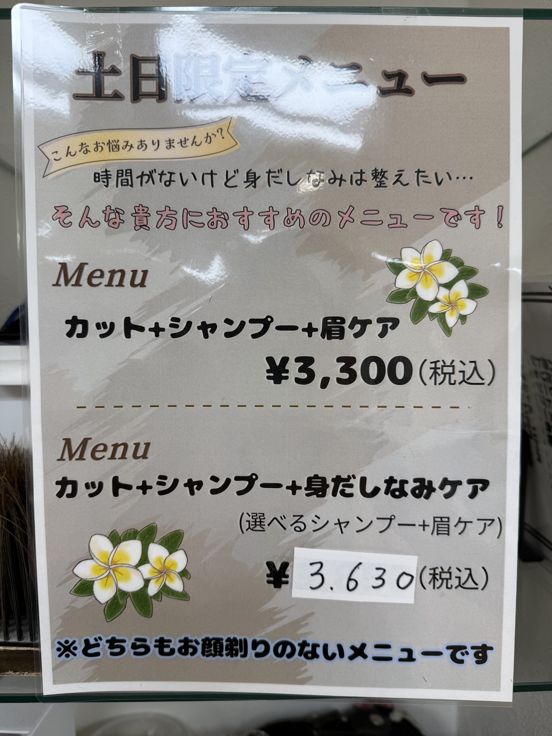 お顔剃りの無いメニューですが、土日限定でやってます。