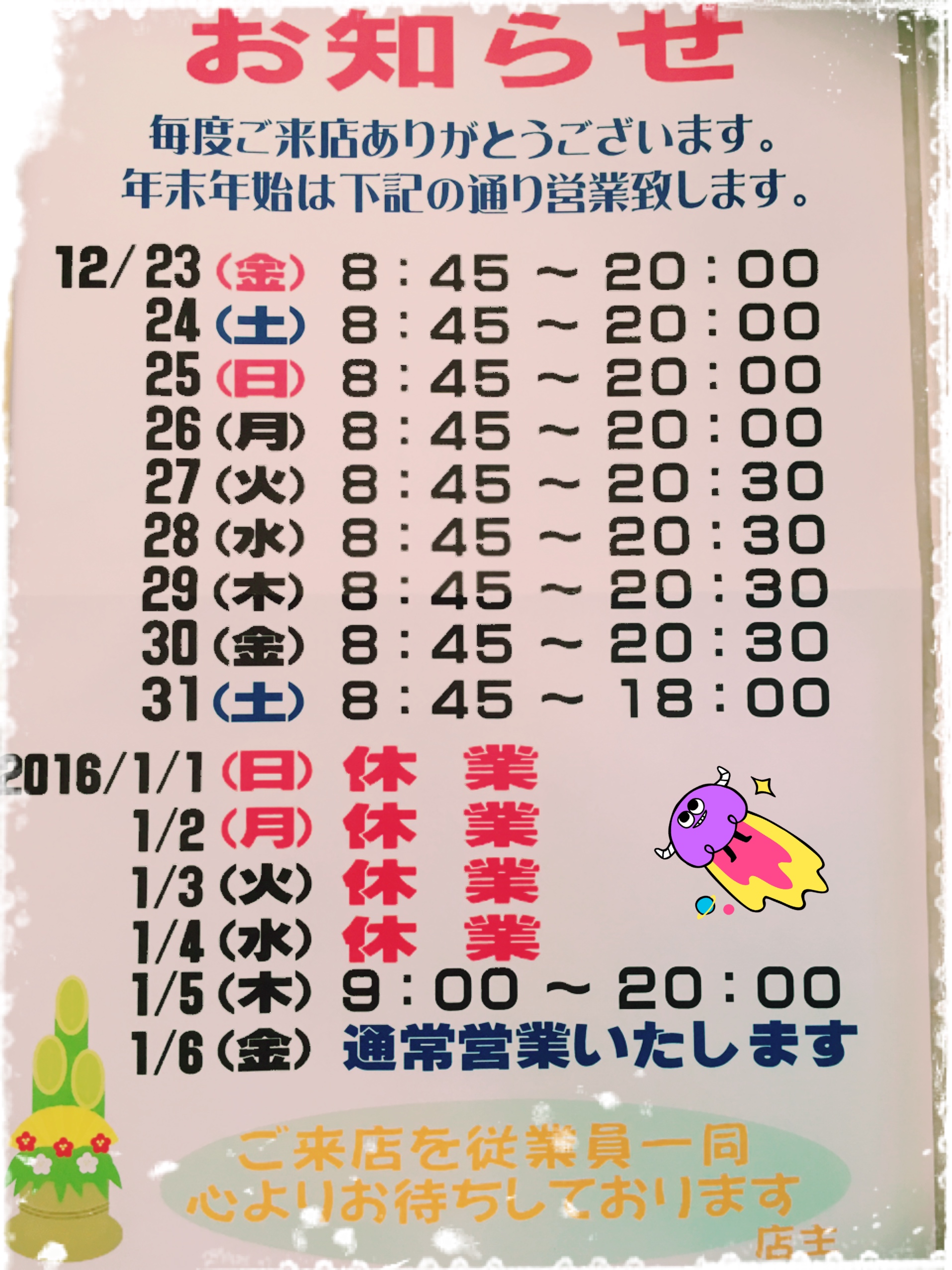 年末年始 営業時間