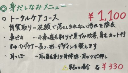 角質取り(洗顔で落としきれない汚れを取り除きます)➕眉ケア➕鼻の産毛剃り➕鼻毛カット➕耳つぼ(耳の産毛剃り、耳のお掃除、耳の指圧)