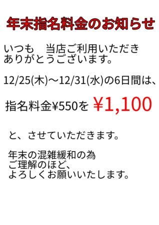 まだ10月ですが、今年の年末は、12/25からは、指名料金¥1,100と、なります。