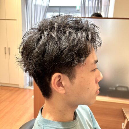 クセを活かして前髪を上げたパートスタイルに仕上げています。