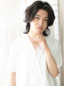 レイヤーとパーマで軽さと動きのある色気たっぷりのミディアムウルフ。ふわっとエアリーな毛流れで、旬なスタイルを実現!耳かけで顔周りをスッキリさせたり、ビジネスシーンはワイルドアップバングがGOOD。