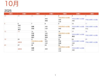 10月 スタッフ休日スケジュール