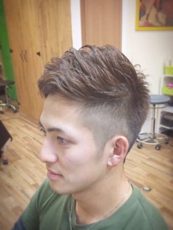サイドからバックにかけてスッキリ刈り上げ、トップからフロントはざっくりと一方に流してスタイリング。