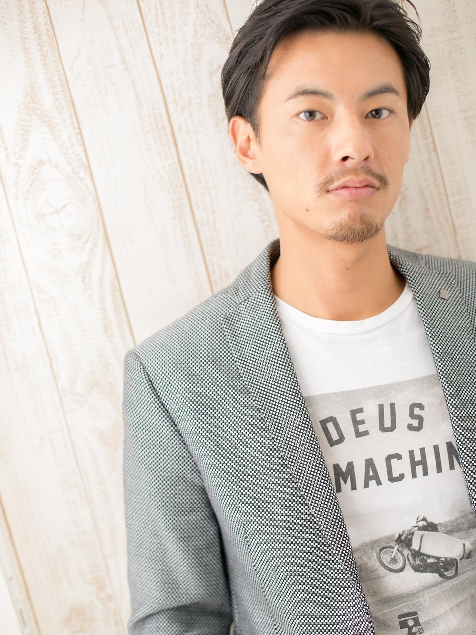 ツヤ感を残したウェットショートでセクシーに。七三で無造作に立ち上げたアップバングで、顔周りをスッキリと。オフの日は前髪をサイドに流してラフにしたり、服装と合わせてトラッドな雰囲気にしてもオシャレ!簡単1分スタイリングで出来ます。