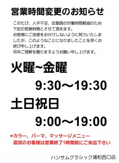 この度は誠に勝手ながら、営業時間変更をさせて頂く事となりました。