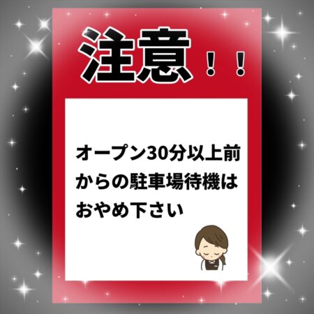 早くやりたいというお気持ちは、本当によくわかりますが、あまりにも早朝早くから駐車場での待機はご遠慮していただきますようよろしくお願いいたしますm(_ _)m